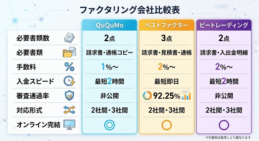 ファクタリング会社が「求める書類が少ない」のは、会社側のシステムが効率化されているからだ。審査の質が下がるわけではない。QuQuMoやビートレーディングは、通帳の入出金データと請求書のみで審査精度を担保している。むしろ、追加で大量の書類を求められる会社の方が、システム化が遅れている可能性もある。書類の少なさを気にするより、手数料と審査スピードに注目した方が建設的だ。